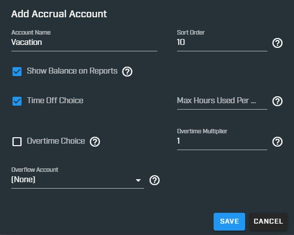 - If you select an overflow account, you can adjust the number of hours that overflow by setting the multiplier to something other than 1.
