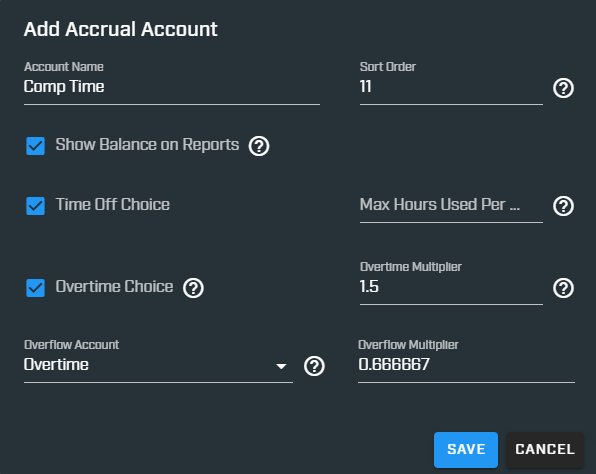 - This specifies how many hours are credited to this account for every hour of overtime worked. Normally, if an employee works 1 hour of Overtime, only one hour is added to the Overtime accrual account. If this is a Comp Time account, then you may want to set it to 1.5, which means if an employee works 1 hour, they would earn 1.5 hours in their Comp Time accrual account.