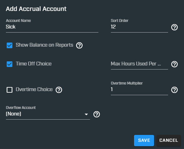 - In some agencies, another example is with Sick Time, where there is a limit, such as 960 hours. At the end of the year, any hours over that limit are paid out to the employee as straight time. In that case, you could set up a separate accrual account called Sick Time Pay, and select that as the Overflow Account, and use 1.0 as the Overtime Multiplier. If they had 10 extra hours at the end of the year, only 10 hours would overflow into the Sick Time Pay accrual account.