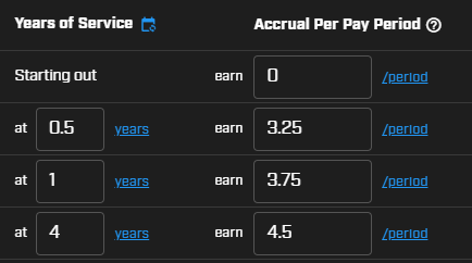 - At ___ years earn ___ /period (enter the year when this first rate changes, such as 0.5 years. Enter the amount their accrual raises to)