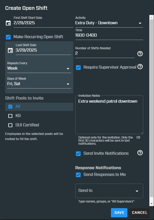 - Send Responses to Me: Check this box to receive notifications when employees express interest in the open shift.