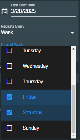Example: Setting the "Repeat Type" to "Week," selecting "Friday" and "Saturday," and specifying a date range for the month will create open shifts for every Friday and Saturday night within that month.